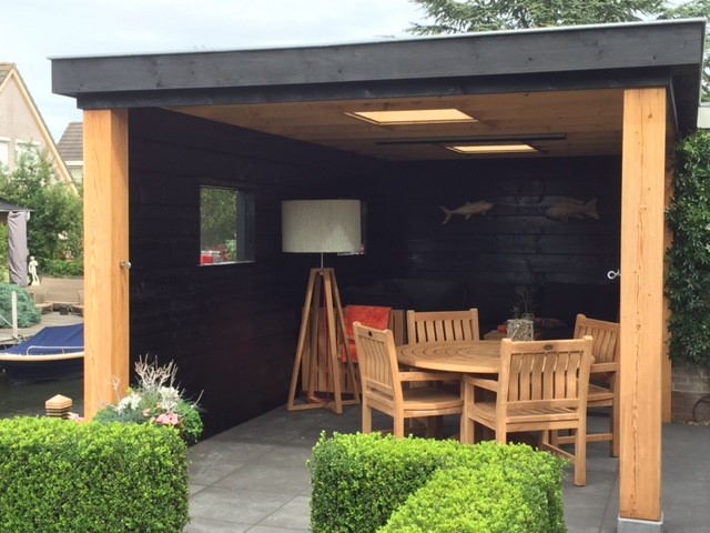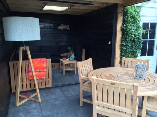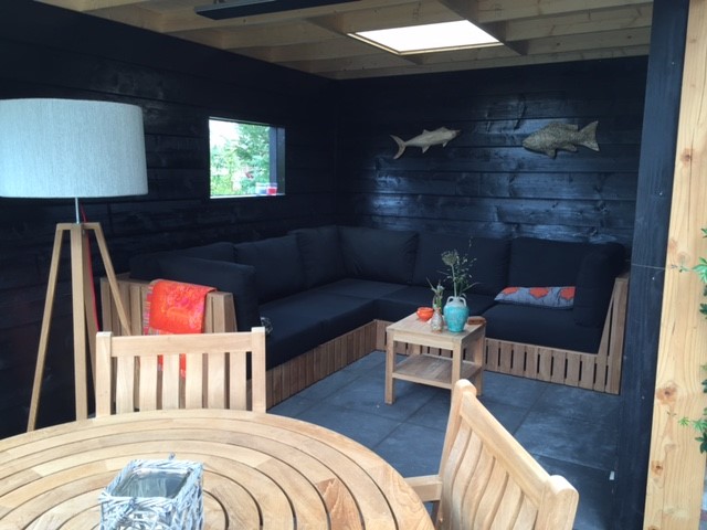Op wens van de klant is de gehele constructie van zowel de schuur als de veranda uit hout opgetrokken. Alle wanden zijn gemaakt d.m.v. dubbele potdeksel constructie. Het platte houten dak is voorzien van een ouderwetse bitume laag waarin 2 glazen thermopane ‘lichtkoepels’ zijn verwerkt.